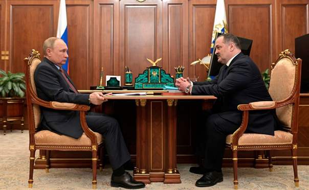 Подпись: Встреча Владимира Путина с главой Республики Дагестан Сергеем Меликовым 6 апреля 2022 года. Фото: пресс-служба Кремля