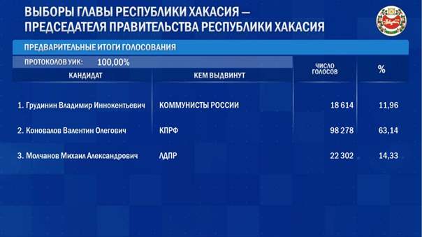 Глава Хакасии Валентин Коновалов победил на выборах и переходит на новый губернаторский срок. После предварительной обработки всех бюллетеней, в его поддержали 63,14% избирателей или более 98 тысяч жителей области. Действующий глава республики выдвигался от партии КПРФ.