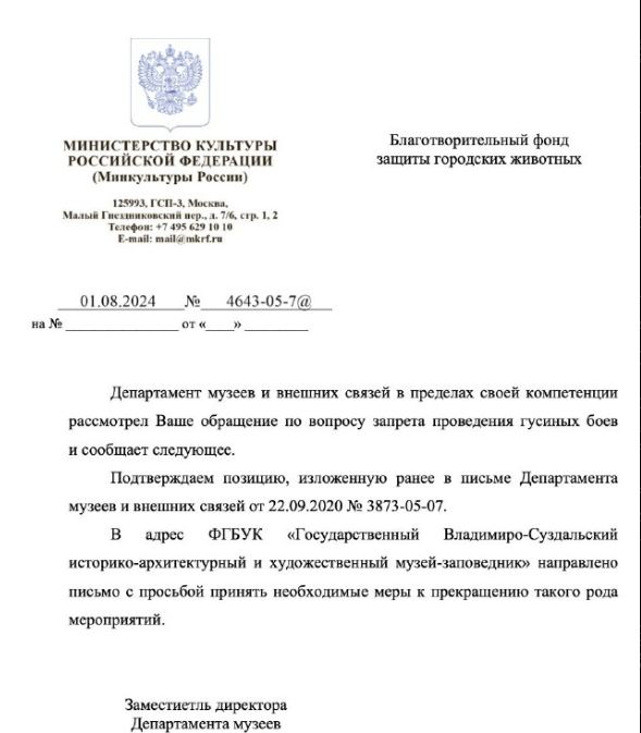 В письме фонду и. о. гендиректора музея-заповедника подчеркивала, что «потехи» не похожи на бои. В письме пояснялось: