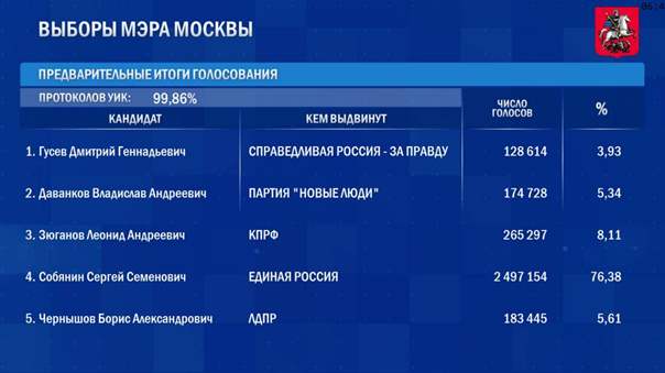 Сергей Собянин остается мэром Москвы на следующие пять лет. Таков итог выборов, которые прошли в столице с 8 по 10 сентября. По предварительным данным Центризбиркома, в результате подсчета 99,86% бюллетеней Собянин набрал 76,38% голосов избирателей, опередив своих соперников с большим отрывом. Переназначение мэра поддержало почти 2,5 млн москвичей. Второй результата показал кандидат от КПРФ Леонид Зюганов, набрав предварительно 8,11% голосов.