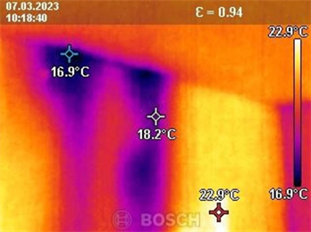 Как видно на снимках со спецоборудования, температура стен в местах обратной тяги доходит до 16,9 °C. В местах, где её нет, – 22,9 °C. Помимо этого, были обнаружены отслоения штукатурки на стенах и недостаточная прочность стяжки на полу.