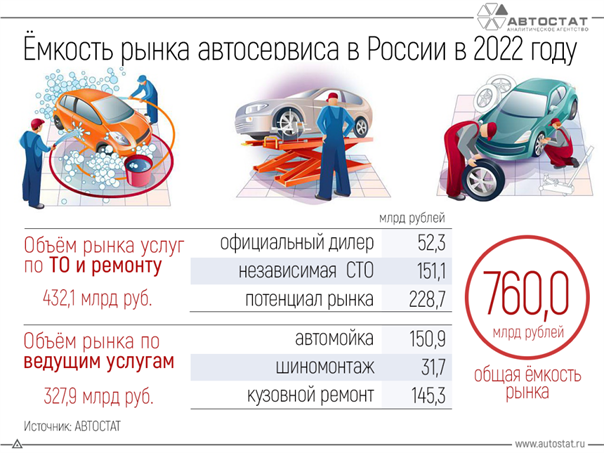Общая ёмкость российского рынка сервисных услуг для легковых автомобилей в 2022 году составила 760 млрд рублей. Кроме того, выяснилось, что в 69 наиболее крупных регионах России числится более 97% парка легковых автомобилей. Именно по ним были предоставлены показатели авторынка.